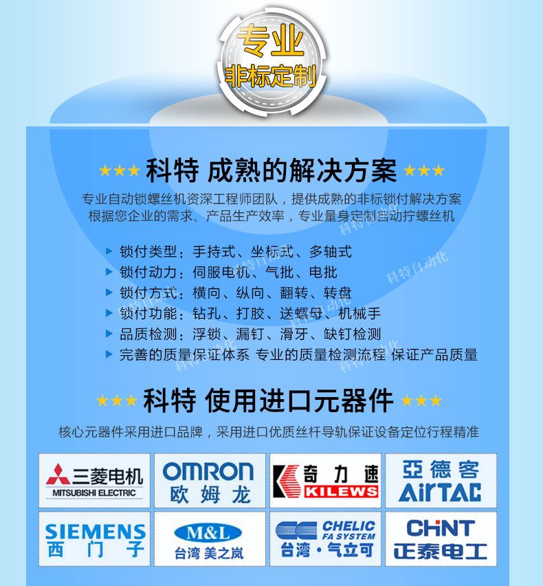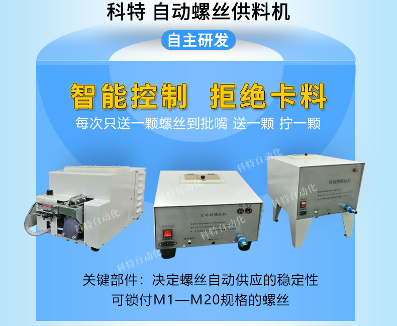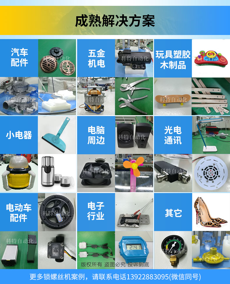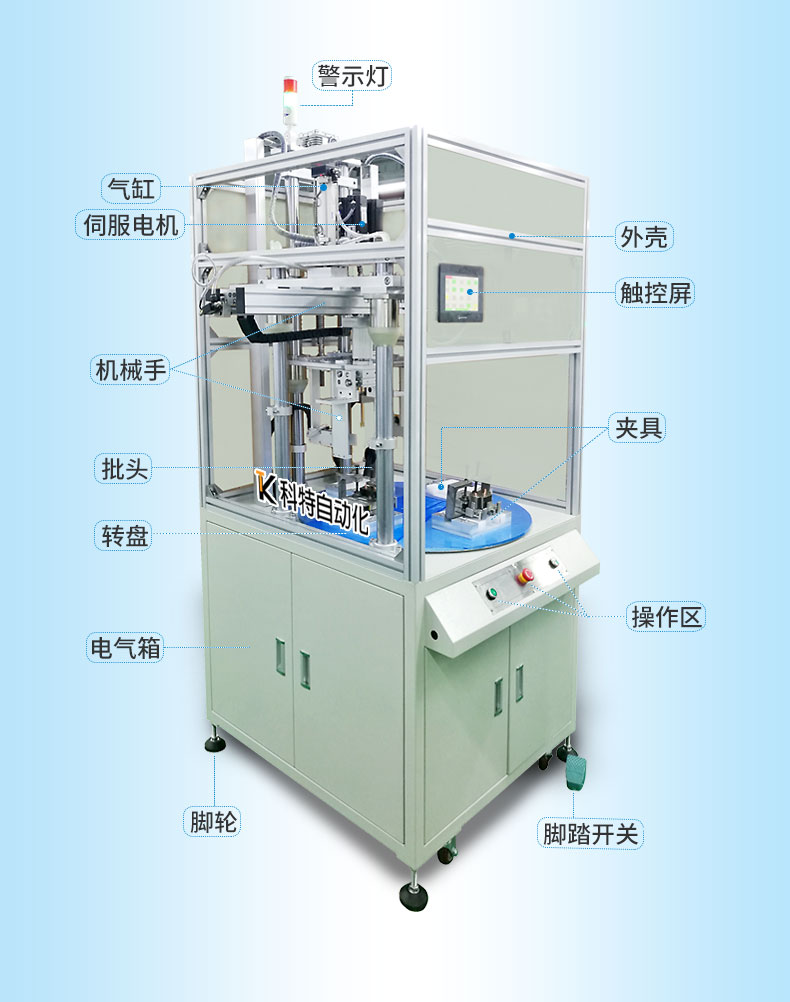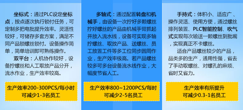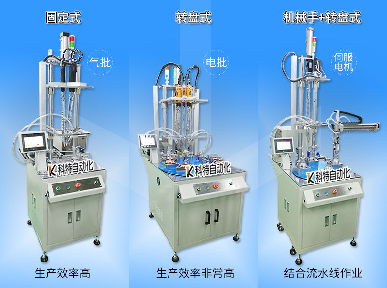 慧晶自動化為解決上述問題為廠家設計了一臺多工位多軸式自動鎖螺絲機,工作臺上設立了多個工位多把電批同時運轉鎖付,通過送螺絲機構進行螺絲的輸送,上下運動裝置接觸螺絲,然后通過鎖螺絲機構對產品進行鎖螺絲作業,大大提高了工作效率,可以實現快速的鎖螺絲作業,特別適用于批量作業,同時通過電機的扭力控制,避免了螺絲欠品和浮鎖現象,保證產品質量,省時省力,節約生產工時,降低企業的生產成本。